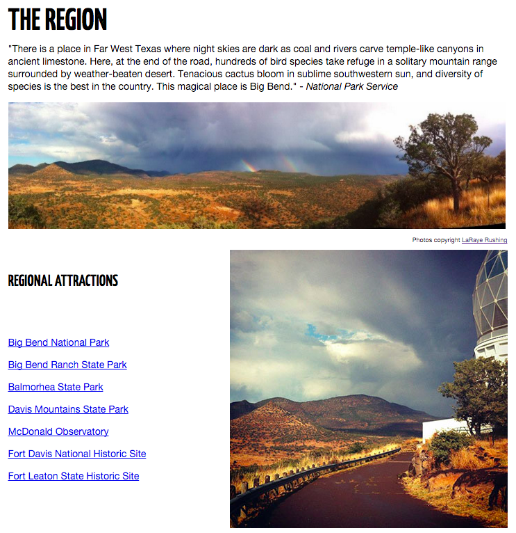 Visit Marfa Website Sep 18 Written By LaRaye Rushing Photographs of the Marfa area featured on the Visit Marfa website. (2012) LaRaye Rushing http://heylaraye.com