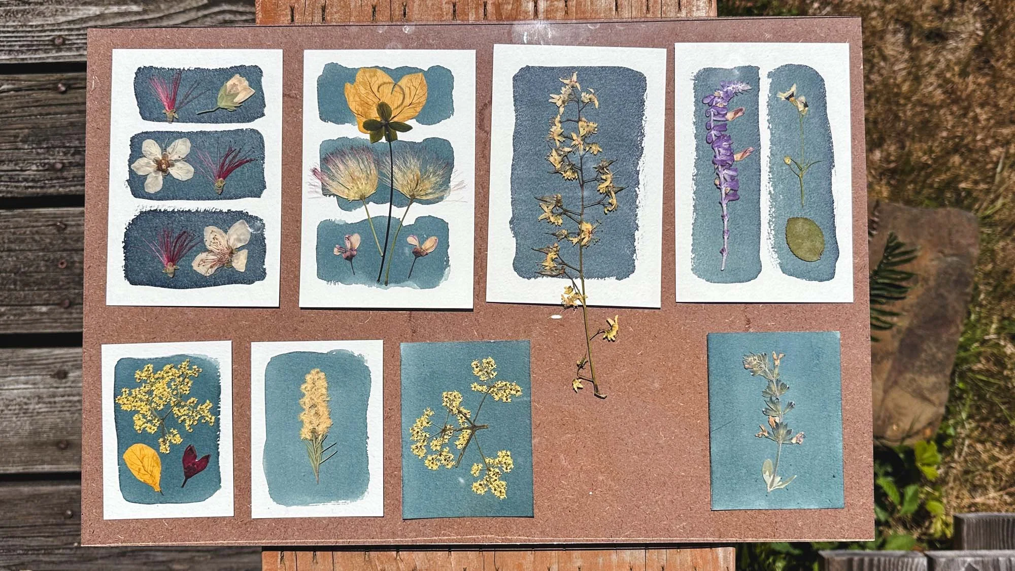 The amount of time to leave it out in the sun depends on many factors such as the time of day and intensity of the UV light. When fully exposed, the paper will turn a silvery color. 10 minutes is a great place to start on sunny day or 20 minutes for a cloudy day. You can adjust for other prints if it’s not the desired blue. In my experience, overexposing doesn’t change the outcome too much depending on the types of plants used. But underexposure will result in a lighter blue. Making a test strip can be helpful to determine more exact exposure times.